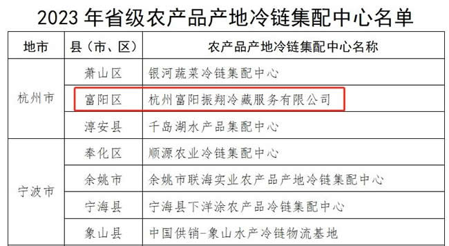 近日,浙江省農(nóng)業(yè)農(nóng)村廳發(fā)布關(guān)于公布2023年省級農(nóng)產(chǎn)品產(chǎn)地冷鏈集配中心認(rèn)定結(jié)果的通知,杭州富陽振翔冷藏服務(wù)有限公司冷庫被認(rèn)定為“省級農(nóng)產(chǎn)品產(chǎn)地冷鏈集配中心”。